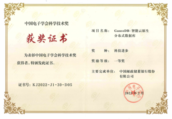 近日,在2022年中國電子學(xué)會科學(xué)技術(shù)獎的評選中,中國郵政儲蓄銀行憑借高斯數(shù)據(jù)庫(GaussDB)在新一代個人業(yè)務(wù)核心系統(tǒng)的全面應(yīng)用與深度聯(lián)合創(chuàng)新,榮獲中國電子學(xué)會科學(xué)技術(shù)獎科技進步一等獎。