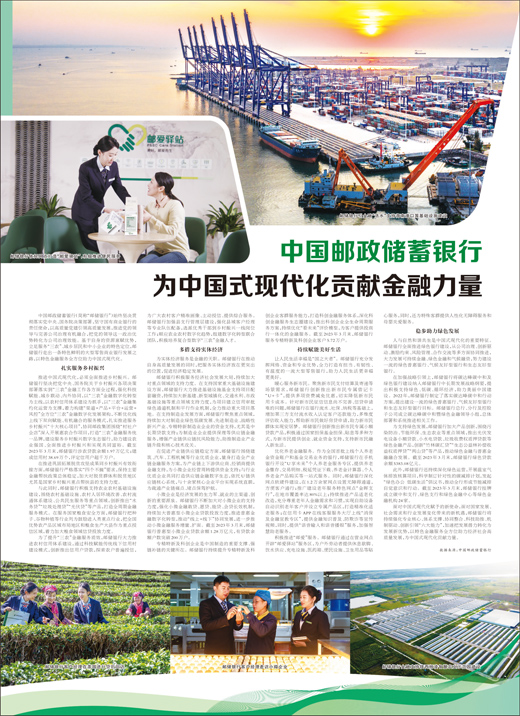 中國郵政儲蓄銀行(簡稱“郵儲銀行”)始終堅決貫徹落實黨中央、國務院決策部署,堅守國有商業(yè)銀行的責任使命,以高質(zhì)量黨建引領高質(zhì)量發(fā)展,推進黨的領導與完善公司治理有機融合,把黨的領導這一政治優(yōu)勢轉(zhuǎn)化為公司治理效能?;谧陨淼馁Y源稟賦優(yōu)勢,立足服務“三農(nóng)”、城鄉(xiāng)居民和中小企業(yè)的特色定位,郵儲銀行走出一條特色鮮明的大型零售商業(yè)銀行發(fā)展之路,以特色金融服務全方位助力中國式現(xiàn)代化。