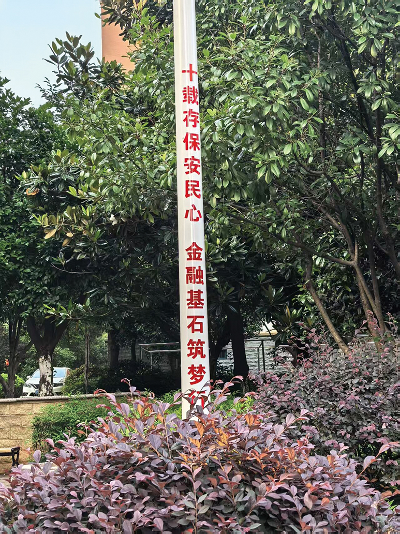 此外,小區(qū)內(nèi)的路燈桿、指示牌等也化身成為宣傳載體,印制著朗朗上口、主題鮮明的標(biāo)語,如“十載存保安民心,金融基石筑夢行”等,讓金融安全知識伴隨著居民的每一步。在公共休閑椅、長廊等休憩點,以及乒乓球桌、健身器材區(qū)、兒童游樂場等活力空間,居民們都可以看到生動有趣的口號和標(biāo)語。這些口號將金融安全理念與健康生活、家庭歡樂場景自然融合,讓居民在輕松愉快的氛圍中學(xué)習(xí)到金融知識。
