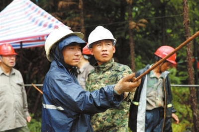 7月6日,咸寧供電公司輸電線路維護員楊忠平與20多名特訓人員冒雨對京廣鐵路供電的110千伏孫鐵線巡視,防止鐵塔傾倒致線路斷電...