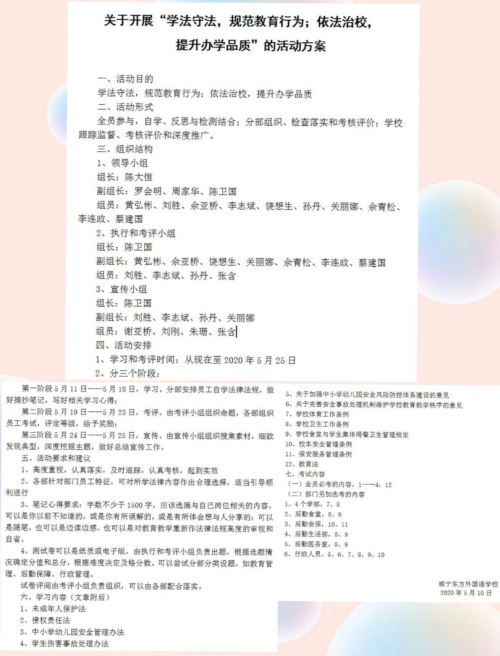 本次“學(xué)法守法,規(guī)范教育行為;依法治校,提升辦學(xué)品質(zhì)”活動在東方外校全體教職工的積極參與中有序組織,順利開展。通過本次活動大家收獲了實效,在法律學(xué)習(xí)中深刻認(rèn)識到本職工作的責(zé)任。同時,堅定了依法辦學(xué),規(guī)范管理,提升服務(wù),打造名校的信心,為學(xué)校營造良好的依法治校環(huán)境起到了積極的促進(jìn)作用。