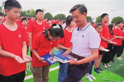 開(kāi)學(xué)典禮上,小學(xué)部彭育東校長(zhǎng)帶領(lǐng)一年級(jí)新生舉行開(kāi)筆禮啟蒙儀式。領(lǐng)導(dǎo)老師們分別在一年級(jí)新生的額頭正中點(diǎn)上“朱砂”,為學(xué)生啟智,現(xiàn)場(chǎng)幾百名師生齊誦《三字經(jīng)》。初中部靳立鴻校長(zhǎng)為七年級(jí)學(xué)生舉行贈(zèng)書(shū)儀式,勉勵(lì)大家讀好書(shū),好讀書(shū)。高中部黎校長(zhǎng)組織舉行了“封信儀式”,現(xiàn)場(chǎng)高一學(xué)生將手寫(xiě)的信件裝進(jìn)信封,由班主任存入學(xué)校檔案室,留待三年后畢業(yè)那一刻重新開(kāi)啟。希望以此信激勵(lì)同學(xué)們不忘初心,堅(jiān)持拼搏。