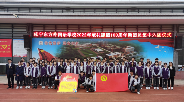 為加強(qiáng)學(xué)校共青團(tuán)隊(duì)伍建設(shè),綻放青春力量,勇?lián)鷷r(shí)代責(zé)任,引領(lǐng)廣大青年聽黨話、跟黨走,以實(shí)際行動(dòng)和優(yōu)異成績(jī)獻(xiàn)禮建團(tuán)100年和迎接黨的二十大勝利召開,2022年5月9日下午5點(diǎn),咸寧東方外國(guó)語校舉行“喜迎二十大、永遠(yuǎn)跟黨走、奮進(jìn)新征程”暨獻(xiàn)禮建團(tuán)100周年新團(tuán)員入團(tuán)儀式。儀式由校團(tuán)委書記張婷主持,全校師生參加,黨支部書記、總校長(zhǎng)韓冀出席。