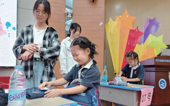 臺上,小選手們緊張有序地將各類物品收納進書包;臺下,加油聲不斷。