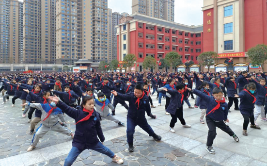“如果你覺(jué)得很冷,請(qǐng)?jiān)嘏埽屔眢w熱起來(lái)……”2月21日上午9點(diǎn)40分,在咸寧高新實(shí)驗(yàn)外國(guó)語(yǔ)學(xué)校進(jìn)校廣場(chǎng),三四年級(jí)共21個(gè)班學(xué)生迅速呈體操隊(duì)形散開(kāi),根據(jù)廣播指令,分別做了武術(shù)操和課間健美操。彼時(shí),天空陰沉,狂風(fēng)吹刮著臉,孩子們站立在風(fēng)中,握拳、踢腿、抱拳彈踢、弓步撩掌,經(jīng)過(guò)了一個(gè)假期,一招一式略顯生疏,卻又顯張力。