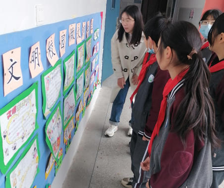 “這是我們班的手抄報!”“她們寫得真好……”宣傳櫥窗前,幾名學生正圍在一起認真觀看里面張貼的手抄報,激動地討論著。
