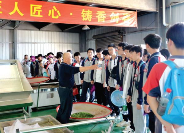 在品味新茶的清香之余,劍春生態(tài)茶園負(fù)責(zé)人、有著50年制茶工藝經(jīng)驗(yàn)的茶學(xué)專家李春洪向同學(xué)們介紹了咸寧的茶歷史、茶文化,讓同學(xué)們感受到厚重綿長的鄉(xiāng)土文化;同時(shí)還介紹了數(shù)字農(nóng)業(yè)和智慧農(nóng)業(yè)技術(shù)在茶產(chǎn)業(yè)發(fā)展中的作用,這也激發(fā)了很多同學(xué)的興趣,并鼓勵(lì)他們筑牢基礎(chǔ)學(xué)科,學(xué)習(xí)新技術(shù)、新工藝?yán)m(xù)寫茶產(chǎn)業(yè)新華章。