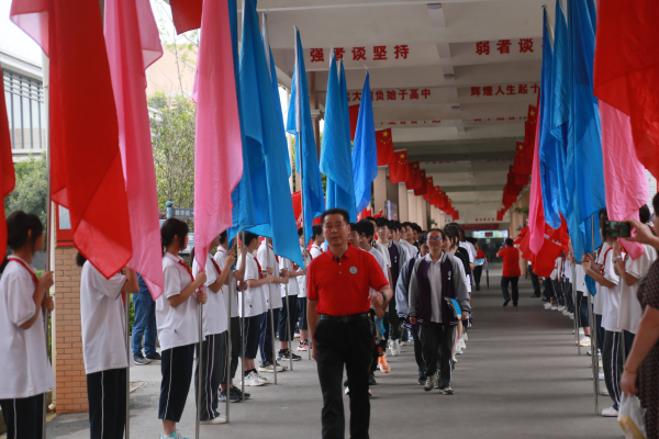 送考隊(duì)伍由全體初中部教師和初一、初二學(xué)生組成。班主任們穿著寓意“開(kāi)門紅”的紅色送考服;學(xué)弟、學(xué)妹們有的手拿小紅旗、有的手持大彩旗,他們一路排開(kāi),為初三學(xué)子們開(kāi)出一條滿是祝福的“送考長(zhǎng)廊”。