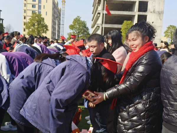 成人禮現(xiàn)場(chǎng),家長(zhǎng)為自己的孩子鄭重戴上“成人帽”、互相“贈(zèng)禮”、擁抱,步入“成人門”、跨入“成功門”,宣告自己長(zhǎng)大成人并為之努力奮斗。