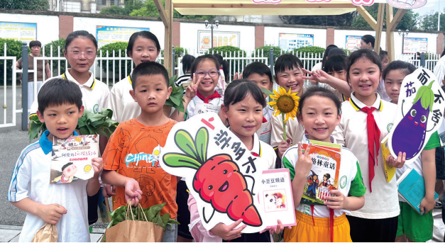 換購(gòu)現(xiàn)場(chǎng),老師們精心布置,主題展臺(tái)滿目鮮綠,瓜果飄香。紙杯蛋糕點(diǎn)綴上剛剛從樹上采摘來的楊梅,讓人垂涎欲滴。一切準(zhǔn)備就緒,同學(xué)們依次排隊(duì)走到換購(gòu)攤位前,無一不被琳瑯滿目的新鮮蔬菜所吸引,他們探著小腦袋,高舉手中的書籍。