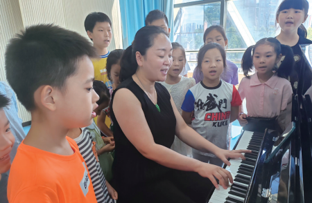 在市群藝館,7歲的小朋友孔清月愛好唱歌,和好朋友一起報名參加了聲樂班。課堂上老師教唱歌、音準(zhǔn),課后,她還能同小伙伴一起玩耍,別提有多開心。
