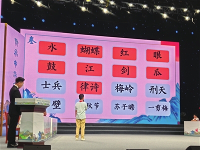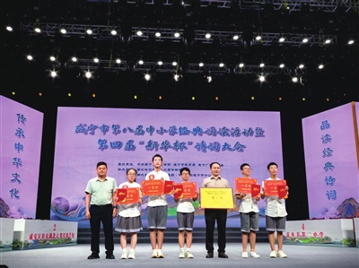 決賽題目主要由中小學(xué)生必背古詩詞和經(jīng)典古詩詞、愛國主義經(jīng)典詩詞、咸寧本土文化經(jīng)典詩詞組成,重點(diǎn)展示學(xué)生平時(shí)的詩詞積累及拓展賞析水平。
