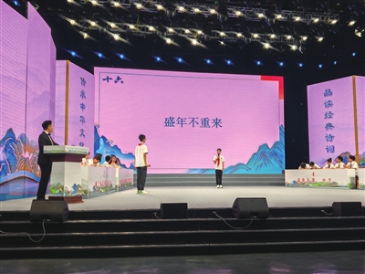 比賽現(xiàn)場氣氛活躍,40名選手們迎戰(zhàn)自如,每答完一道題都會迎來觀眾的陣陣掌聲。團(tuán)體答題環(huán)節(jié),緊張激烈,飛花令更是精彩紛呈,選手們你來我往,展現(xiàn)了大家深厚的詩詞經(jīng)典積累和敏捷的反應(yīng)能力,帶領(lǐng)觀眾沉浸式體驗(yàn)詩詞之美。