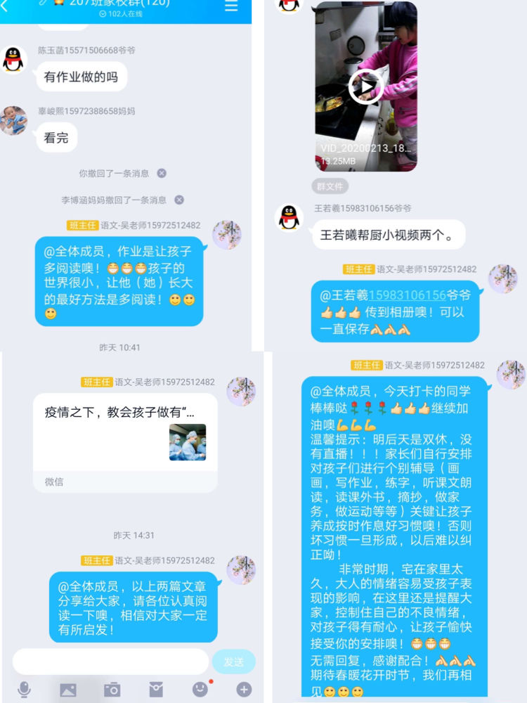 嚴(yán)峻的疫情不僅給一線的病人和醫(yī)護(hù)人員帶來了很大的傷痛,對整天呆在家里的家長和孩子同樣帶來了精神上的壓力。作為一名人民教師,在抗疫攻堅(jiān)期,我們應(yīng)當(dāng)肩負(fù)起責(zé)任,積極統(tǒng)計(jì)好班級防疫數(shù)據(jù),安撫情緒,解答疑惑,做好心理輔導(dǎo),組織學(xué)生做好在線學(xué)習(xí)工作,科普防疫知識??希望通過這樣的方式,能為在疫情中困頓的小朋友們送去精神的光亮,學(xué)校的溫暖,希望的力量。
