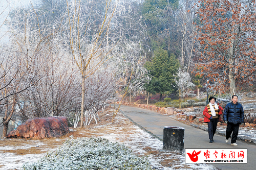 昨日的一場(chǎng)大霧籠罩整個(gè)城市,霧氣茫茫。當(dāng)天上午9時(shí)許,大霧漸漸散去,在城市中難得一見的霧凇奇觀出現(xiàn)在溫泉濕地公園一帶。放眼望去,一片垂柳、花木、樹梢凝霜掛雪,晶瑩剔透,宛若玉枝垂掛,格外妖嬈,十分壯觀。霧凇美景讓來(lái)過往的行人陶醉在如詩(shī)如畫童話般的世界里。(趙忠志/攝)