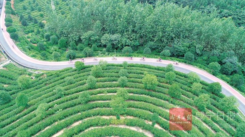 在汀泗橋鎮(zhèn)黃荊塘村,自行車愛好者騎行于茶園中。