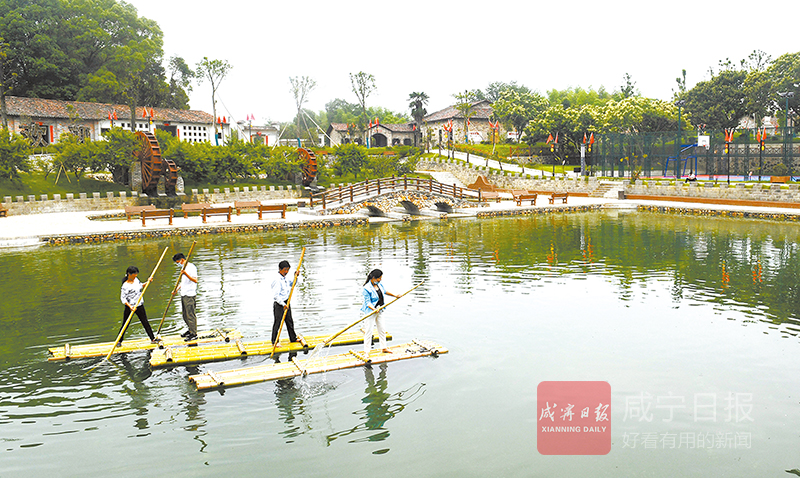 在關(guān)刀鎮(zhèn)高沖公社,一群游客在劃竹排、賞美景。