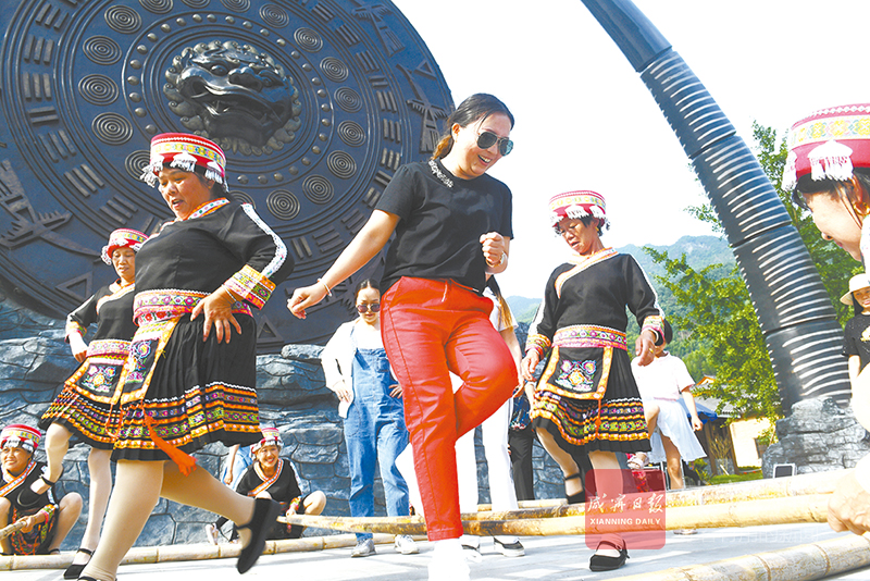 在大坪鄉(xiāng)內(nèi)沖瑤族村,游客和表演者現(xiàn)場互動,跳起竹竿舞。