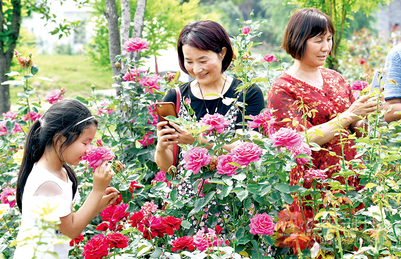 在麥?zhǔn)墟?zhèn)冷塅月季莊園,游客在賞花拍照。