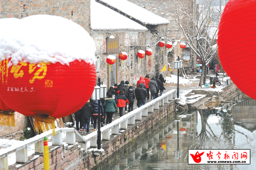 元月3日,一批來自武漢的游客在劉家橋古民居觀景賞雪。新年第一天,我市普降瑞雪,漫天飛舞的大雪仍擋不住游人的腳步,各景區(qū)內(nèi)游人如織,泡溫泉、游農(nóng)家、賞雪景成為節(jié)日休閑時尚?! ∮浾摺〈髽贰z