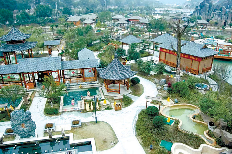 自然園林式的景觀溫泉區(qū),整體設(shè)計(jì)保持天然風(fēng)貌,溫泉從石洞中涌出,蜿蜒流淌在湖畔山間。置身于溫泉池中,俯看青山翠谷的綿延山巒,在瀑布濺起的霧氣和溫泉?dú)桦车乃畾庵?,享受瀑布、青山、藍(lán)天,便有了“人間天堂”的感覺(jué)。