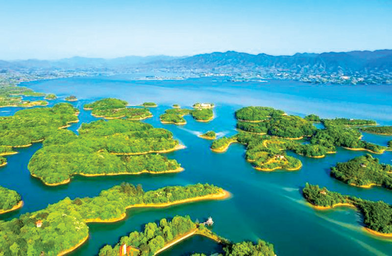隨一群游客登上游船的甲板,360度山島湖景便一覽無余。依靠船欄,吹著湖風(fēng),賞碧水藍(lán)天,一汪蕩漾的湖水、一抹黛青色的群山。
