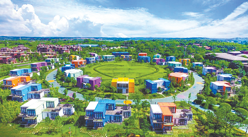 開心農(nóng)場的育苗館里,翠綠的蔬菜和鮮艷的番茄充滿生機(jī),南湖北湖像一塊翡翠鑲嵌在大地上,一幢幢藍(lán)頂白墻別墅坐落在湖邊,初夏的田野鄉(xiāng)村公園五彩斑斕。