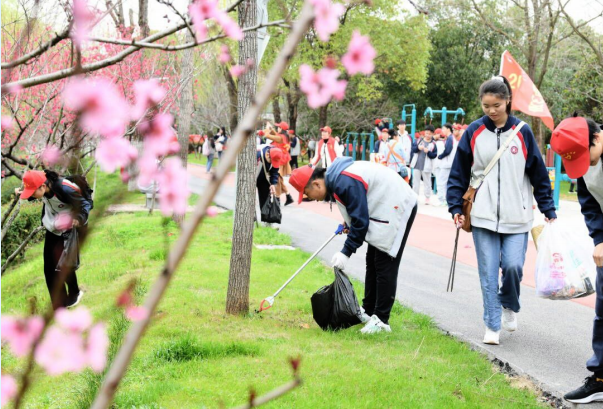 3月12日,鄂南高級(jí)中學(xué)2022級(jí)高一年級(jí)學(xué)生沿著淦河邊撿拾生活垃圾。咸寧日?qǐng)?bào)全媒體記者陳紅菊攝。