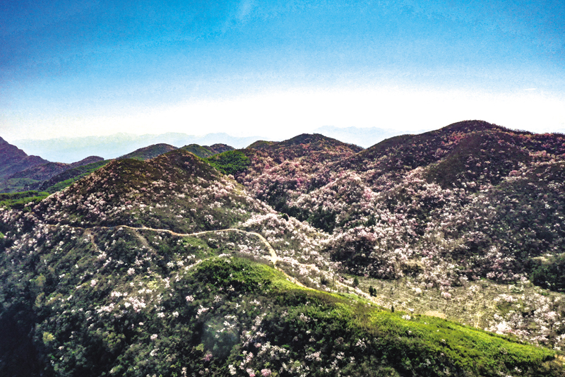 3月26日,崇陽(yáng)縣銅鐘鄉(xiāng)大嶺村櫻花谷的野櫻花進(jìn)入盛花期,漫山遍野的野櫻花一團(tuán)團(tuán)、一簇簇鑲嵌在山間,像給青山披上了一件霞衣。