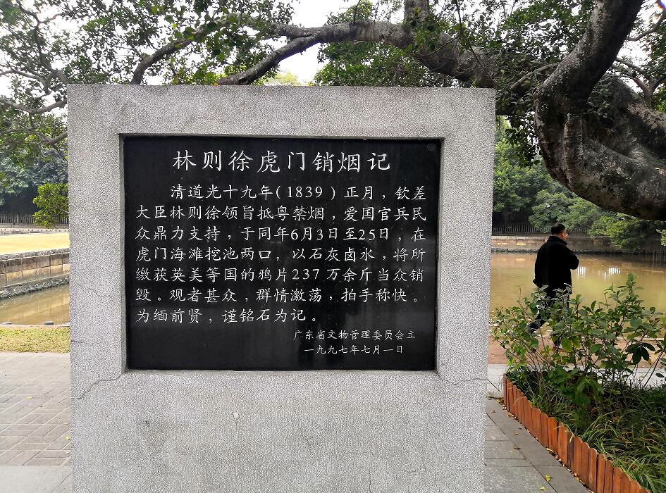 真正的銷煙池在進(jìn)門不遠(yuǎn)的左側(cè),分別為兩個長寬為50米左右的正方形水池,池不深,大概一米左右,岸邊綠樹掩映,其中一棵巨大的榕樹樹葉幾乎遮住了半個池子。盡管已有近兩百年的歷史了,但由于維護(hù)得當(dāng),一直保持著原貎。正是當(dāng)年這兩個不怎么顯眼的煙池,上下翻騰的鹵水煎熬的不僅是收繳來的鴉片,同時還有日薄西山的滿清政府。
