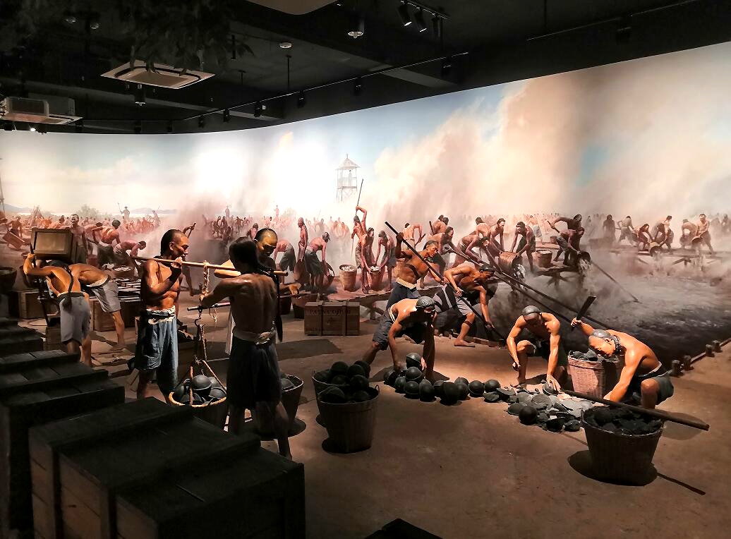 中軸線盡頭是鴉片戰(zhàn)爭博物館,走進(jìn)博物館,里面擺放著或從民間收集來的實物,或制作逼真的蠟像雕塑,或精心打造的影視資料等,并加以文字說明,展現(xiàn)了當(dāng)年那場銷煙運(yùn)動的歷史背景,再一次加深參觀者對那場禁煙運(yùn)動的歷史印象。