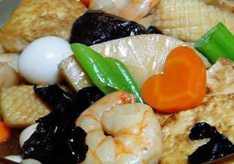 提前泡好香菇和黑木耳;豆腐切厚片,平鋪在厚紙巾上吸水分,兩面煎至金黃;蝦仁和魷魚洗凈,魷魚切花刀,都用開水燙一下;鵪鶉蛋煮好剝殼;胡蘿卜,筍切片;姜切片,蔥切成段。