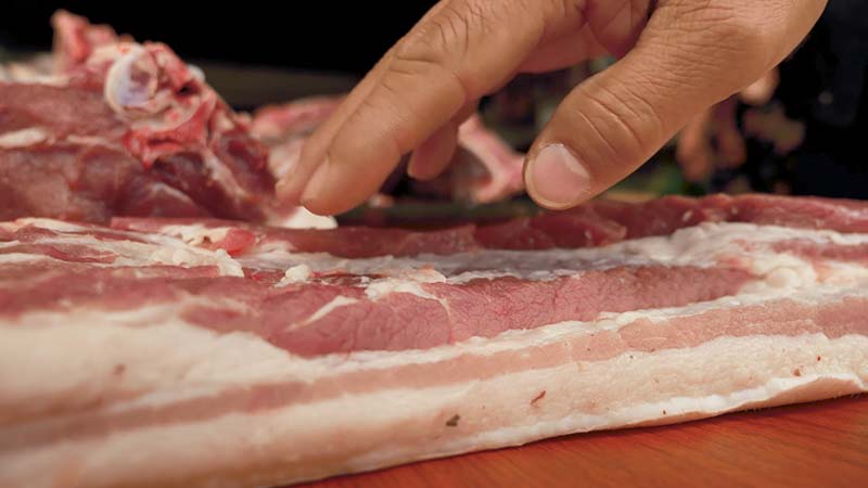 洗凈的新鮮五花肉在廚房解刀時,約好要來的客人這時也開車到了。