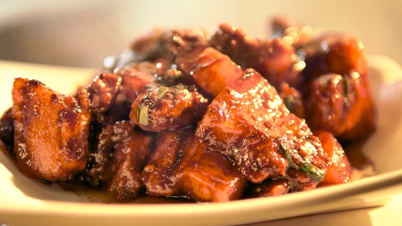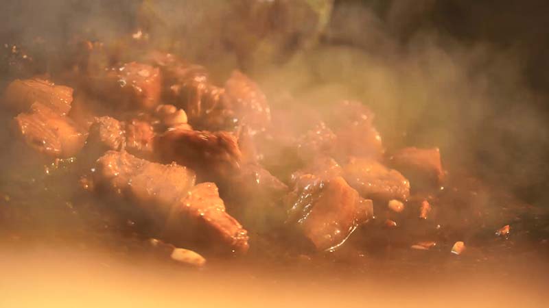 差不多熟后就撈起。再次下鍋燜燒,中間加入早就備好的麥醬,翻炒、入味、上色、很快就能裝盤。