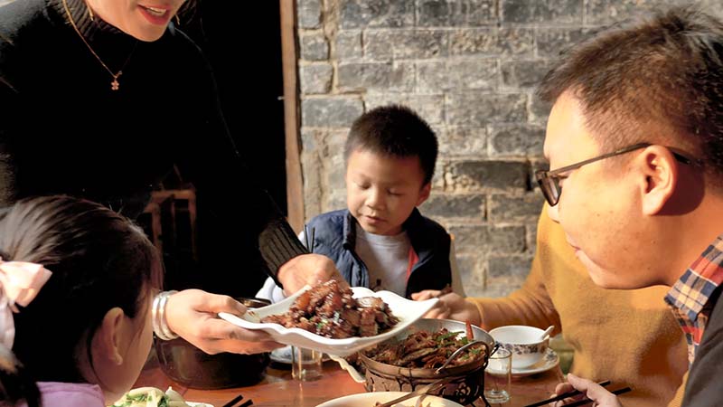 正是入冬時,女主人王小蘭從老屋貯藏間,端出一壇夏天入伏后曬好的麥醬,來村游玩的客人點名要吃麥醬燒肉,她需要提前將麥醬舀出待用。