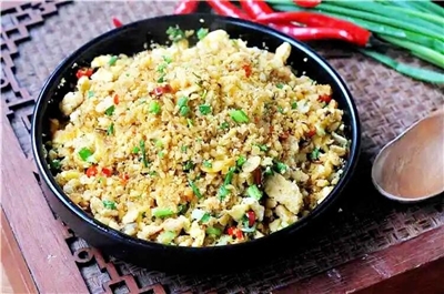 豆渣顧名思義,是生產(chǎn)豆奶或豆腐過(guò)程中的副產(chǎn)品。它在發(fā)酵成長(zhǎng)的過(guò)程中,把豆渣緊密地凝結(jié)在一起。遠(yuǎn)遠(yuǎn)看,如同鋪了厚厚一層雪,氨基酸含量非常高,是一道營(yíng)養(yǎng)豐富的菜肴。