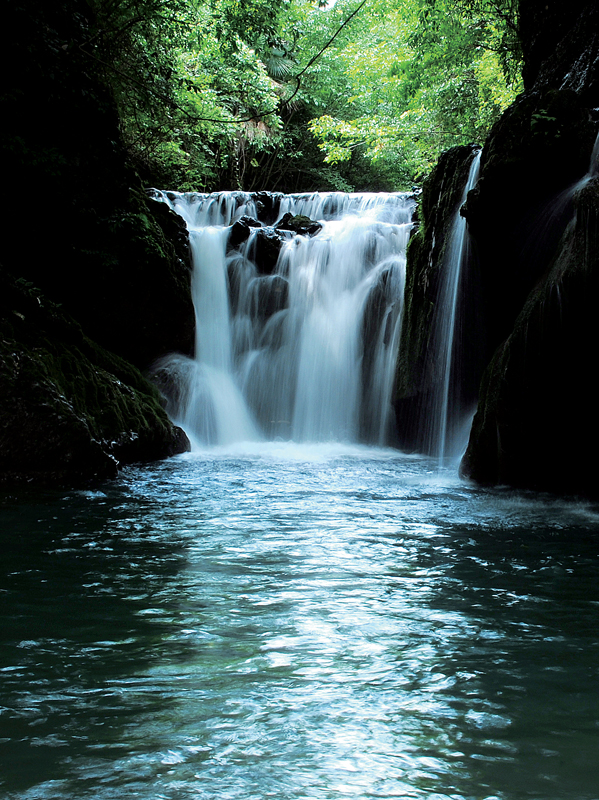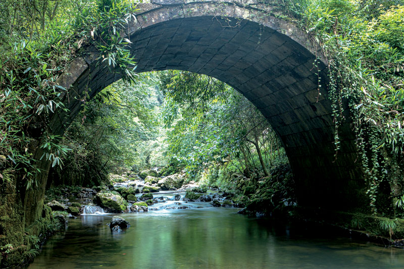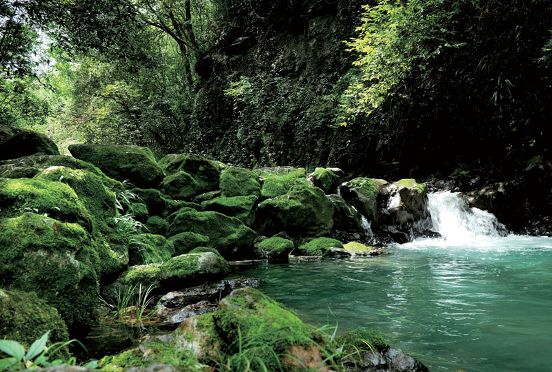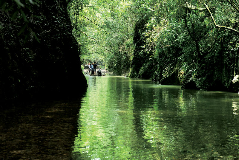沿溪流而下,進(jìn)入一條大峽谷。兩岸青藤古蔓密布,竹木青翠參天,谷中之水色彩斑斕、清澈透明。沿途溶洞、古橋、瀑布、山泉、水潭、巨石、水草、沙灘交替。崖壁上,古人開鑿的水渠、小路仍依稀可見……
