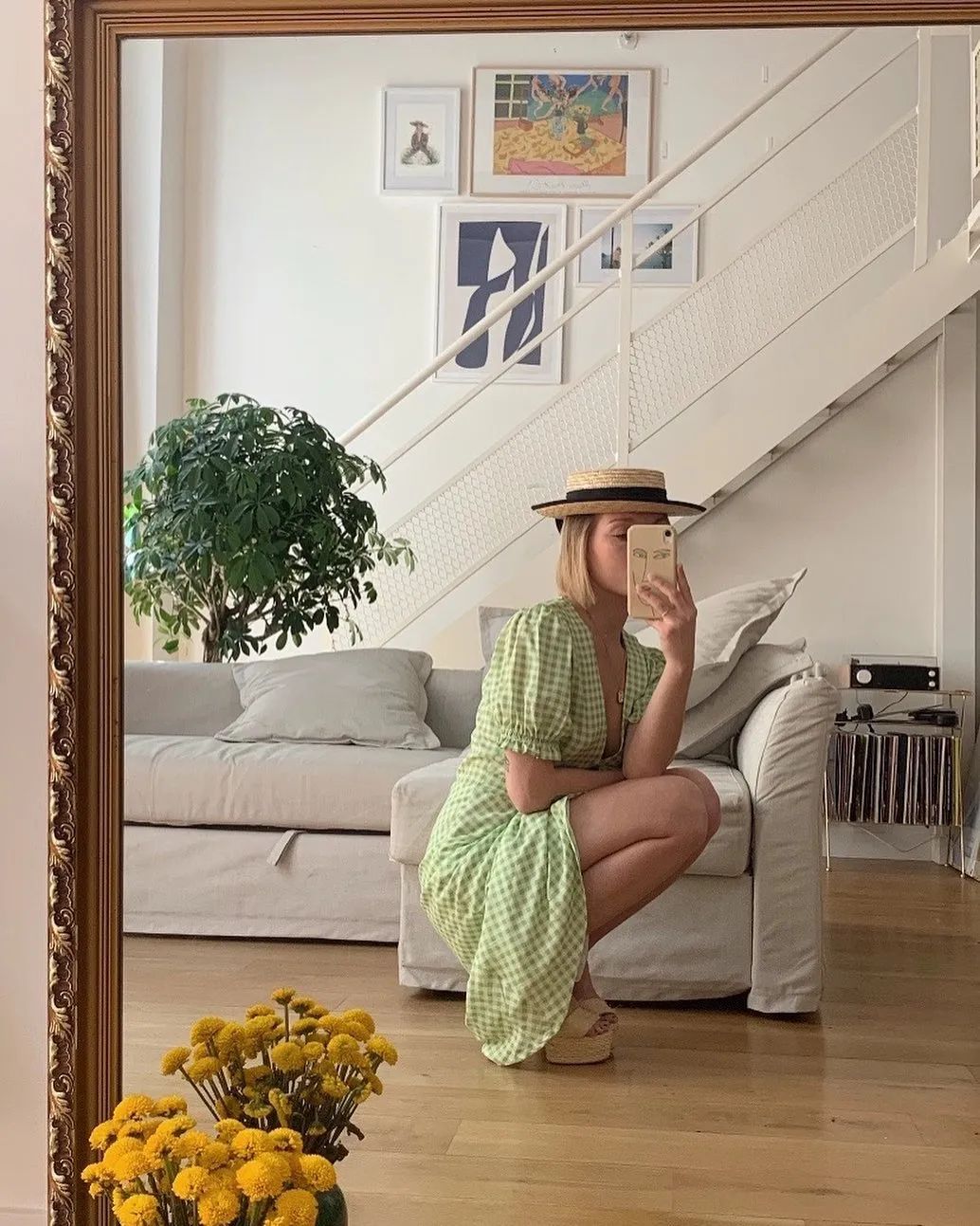 比如法式對(duì)鏡穿搭系列,我們也可以為自己在家中復(fù)刻一個(gè)拍照角,一面黃銅框大鏡子加上一些花朵,隨便拍拍都很好看。