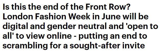 而就在昨天倫敦時裝周也祭出了最新的決定,根據(jù)《每日郵報(Daily Mail)》報導(dǎo)指出,六月的倫敦時裝周將全面改為線上進行,其中也包含設(shè)計師訪談及展間預(yù)覽等。斗大標(biāo)題「首排看秀將走入歷史?(Is this the end of the Front Row?)」對于未來是否還有實體看秀打了個問號。