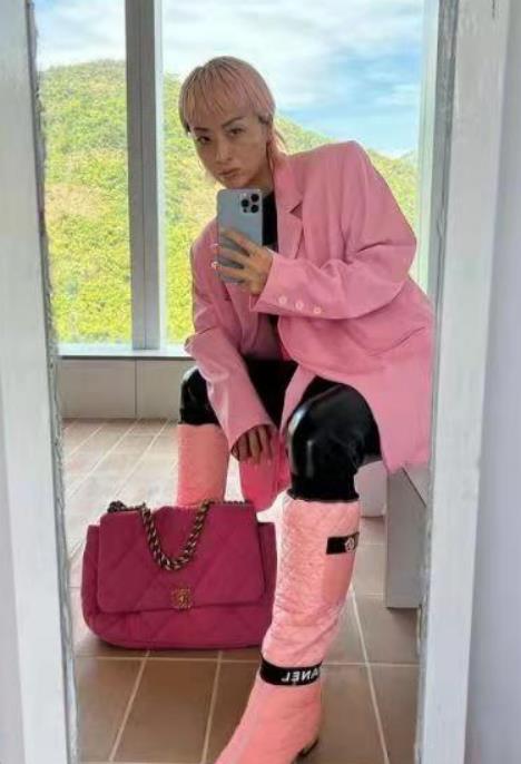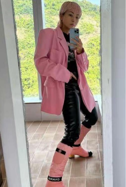 47歲的徐濠縈的風(fēng)格仍然不落俗套、前衛(wèi)。她留著粉紅色的短發(fā)。她很頑皮可愛。她的粉紅色外套和粉紅色靴子互相呼應(yīng)。她的內(nèi)層和皮褲是黑色的,帶有全彩效果,就像她是動(dòng)畫中的角色一樣。
