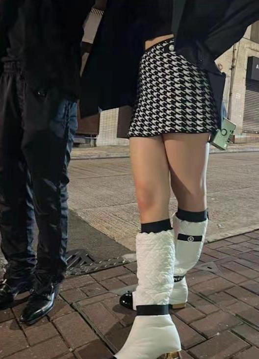 她穿著和她母親一樣的靴子,但卻是黑白相間的。她的上半身在夏天,下半身在冬天。徐濠縈還問網(wǎng)友它是粉紅色還是白色?