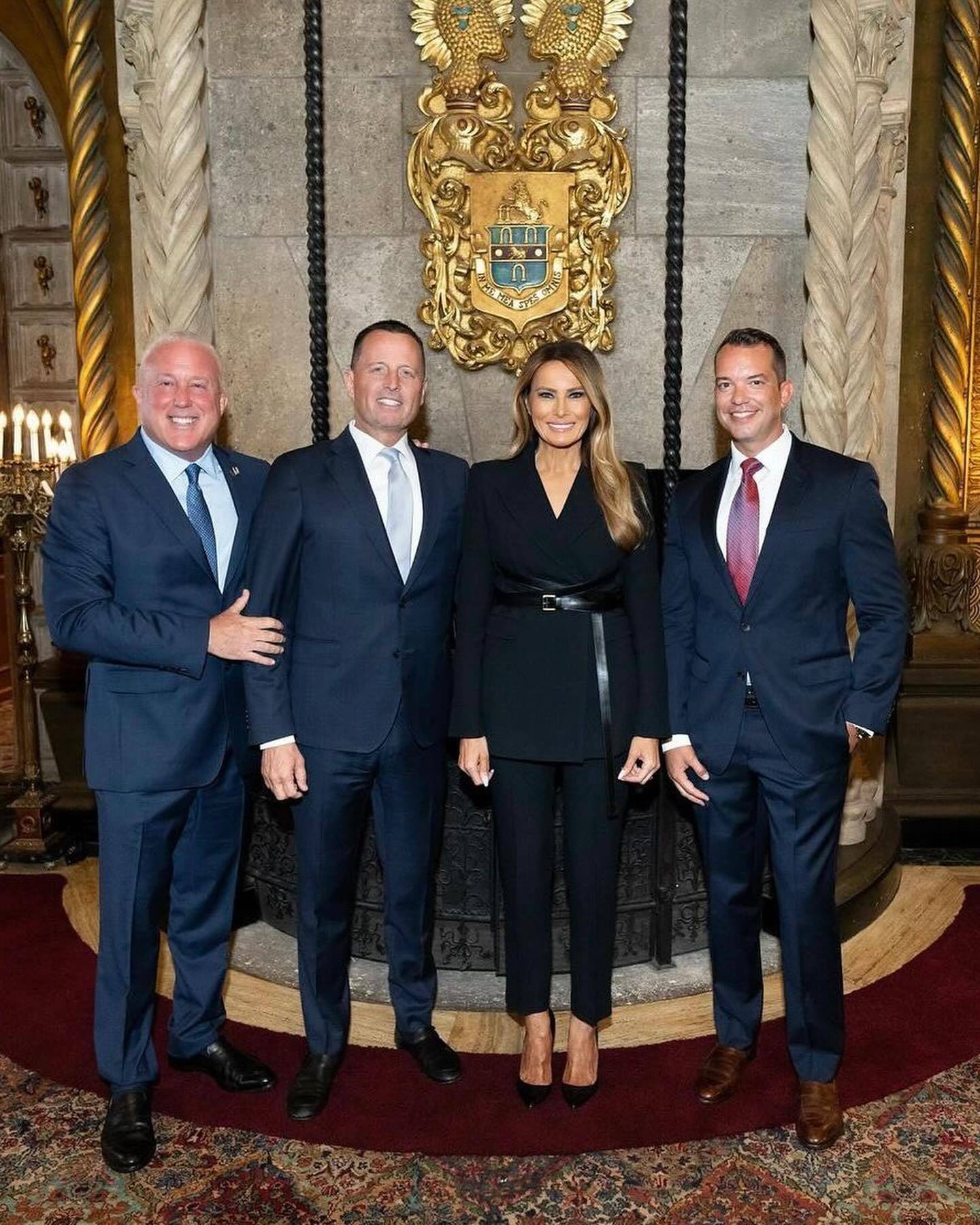 出席這次籌款活動(dòng)的梅拉尼婭,一身黑色的西服套裝亮相,中長款的收腰西裝用黑色皮腰帶點(diǎn)綴,讓一身黑色有了層次感。