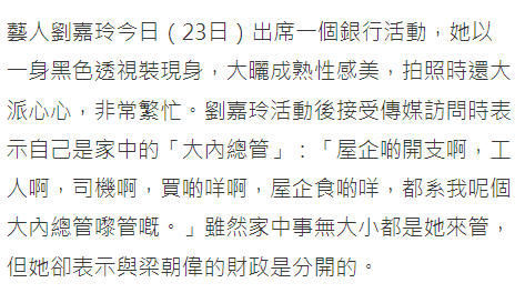 另外她還分享,自己在家里是“大內(nèi)總管”,家里的一切大小事務(wù)都是劉嘉玲在管理的,不過她和梁朝偉的財(cái)務(wù)則是分開的。