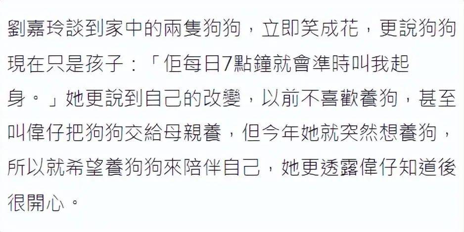 劉嘉玲自己也表示,養(yǎng)了兩只寵物狗之后變得特別開心。