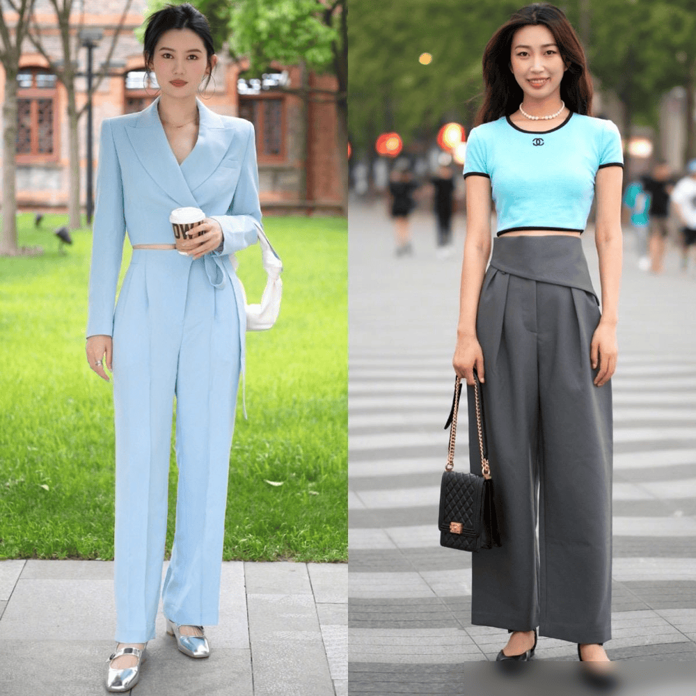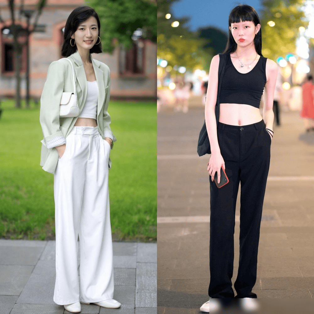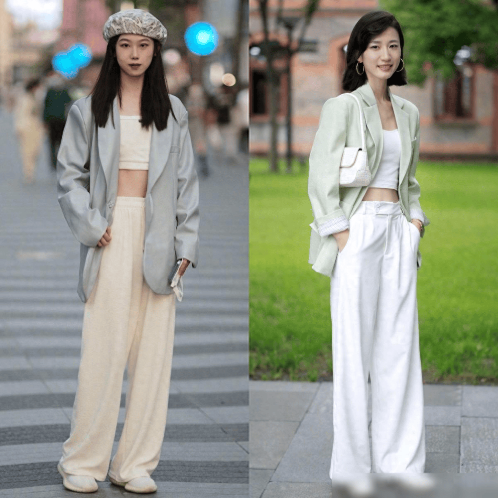 然后就是研究一下顏色搭配,找到喜歡或最近流行搭配風格,再進一步尋找與闊腿褲形成對比色彩、上衣與下身形成對比色彩有助于提高你的審美水平和設計能力,同時提升穿搭效果。