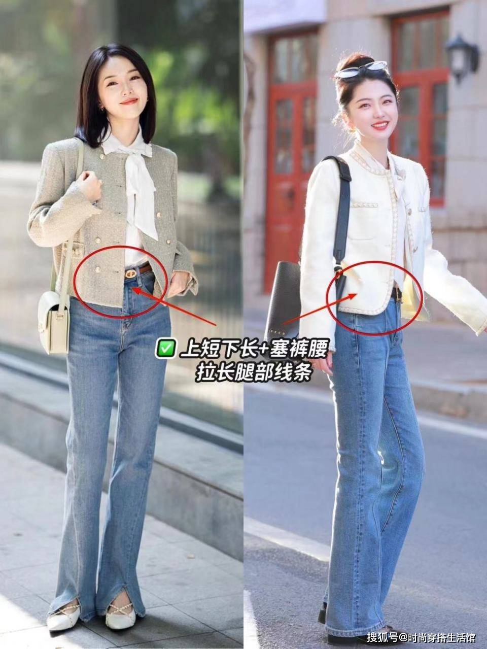 要顯腿長的一個關(guān)鍵就在于我們腰身的位置,有時候你要選的腰線位置就影響了你的腿長,腰線位置高,腿看上去會長一些,腰身位置低,腿也會因此被縮短,所以選擇直筒褲一定要注意挑選高腰款式。搭配的時候要借助這種短款的小香風外套去銜接,才能夠避免把腰線給遮擋住。