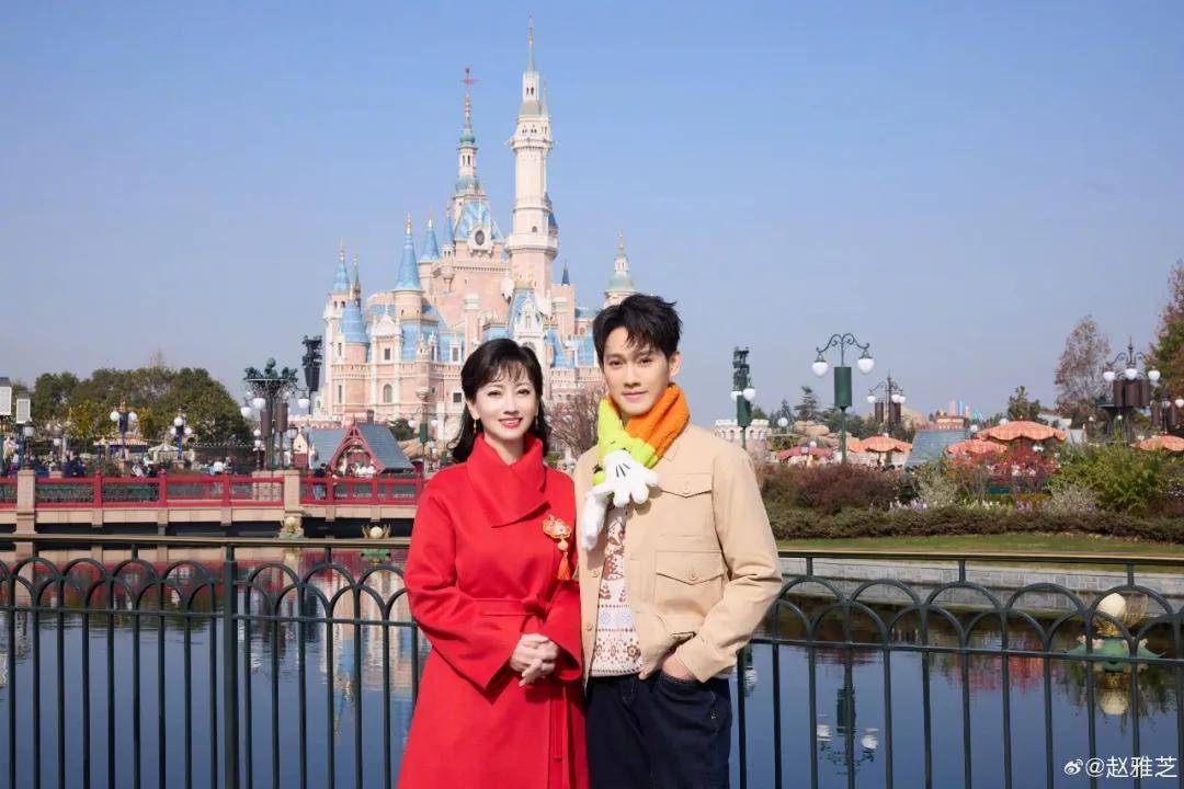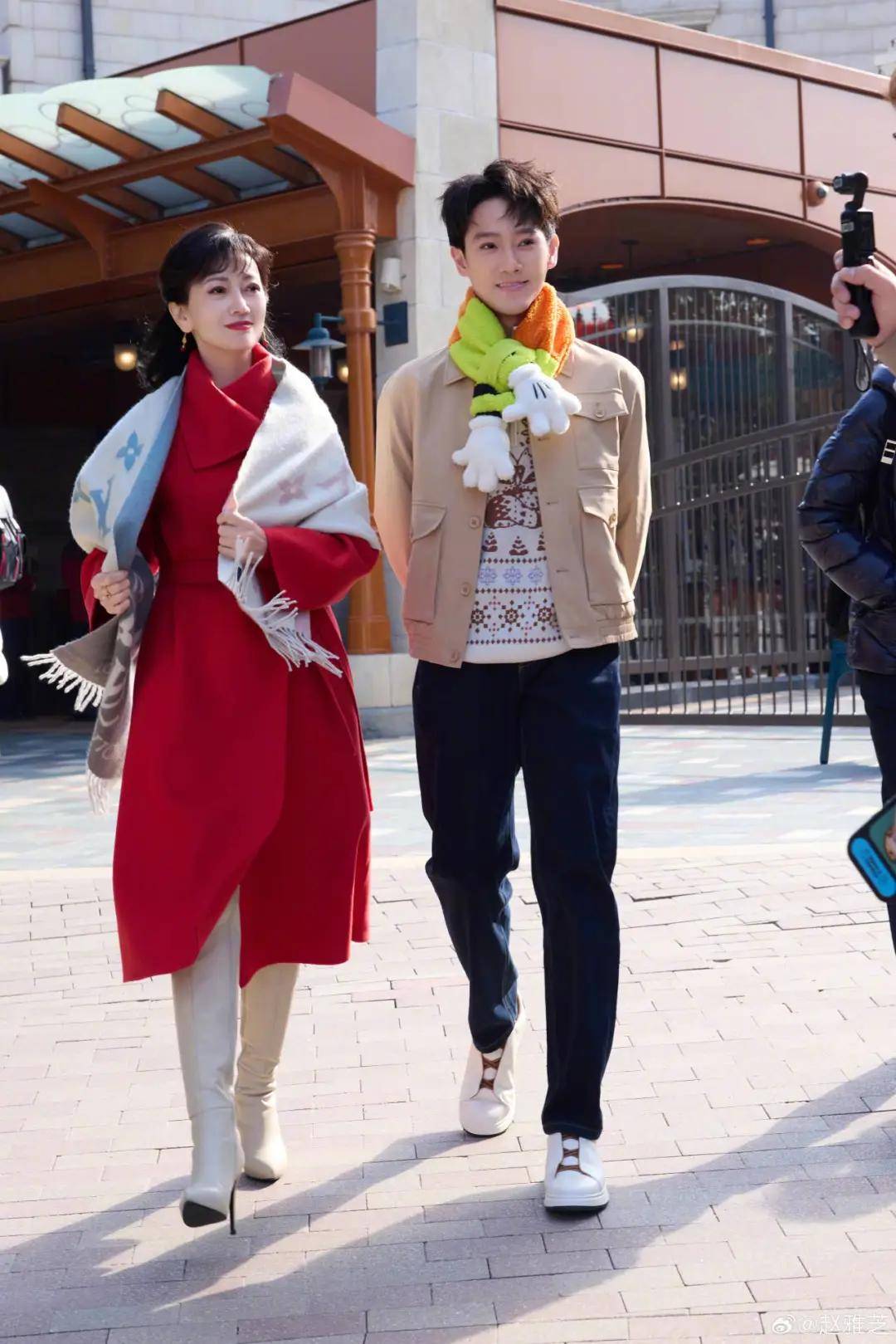 身穿GIADA Amber雙層羊絨紅色大衣,和兒子黃愷杰一同亮相迪士尼,搭配白色長筒靴,兩人站在一起像是姐弟。