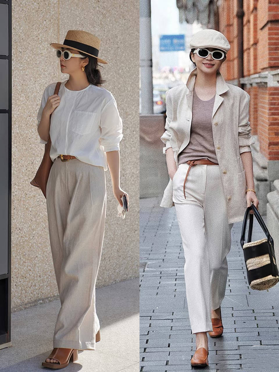 棉麻質(zhì)地的白襯衫、配一條高腰的闊腿褲,這種白襯衫+亞麻色闊腿褲的組合,溫柔親膚、特別顯氣質(zhì)。早春穿著還可以配一件防風(fēng)的外套。