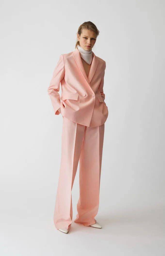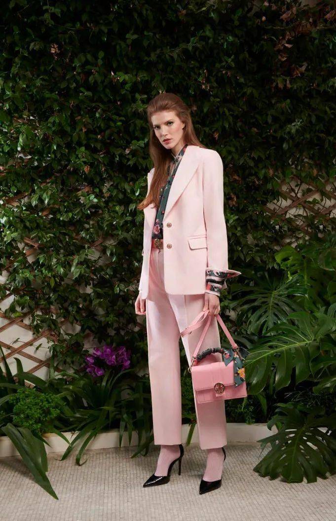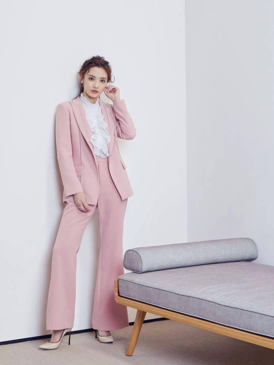 彭小苒用粉色套裝搭配白色荷葉邊襯衫,太太太甜了。
