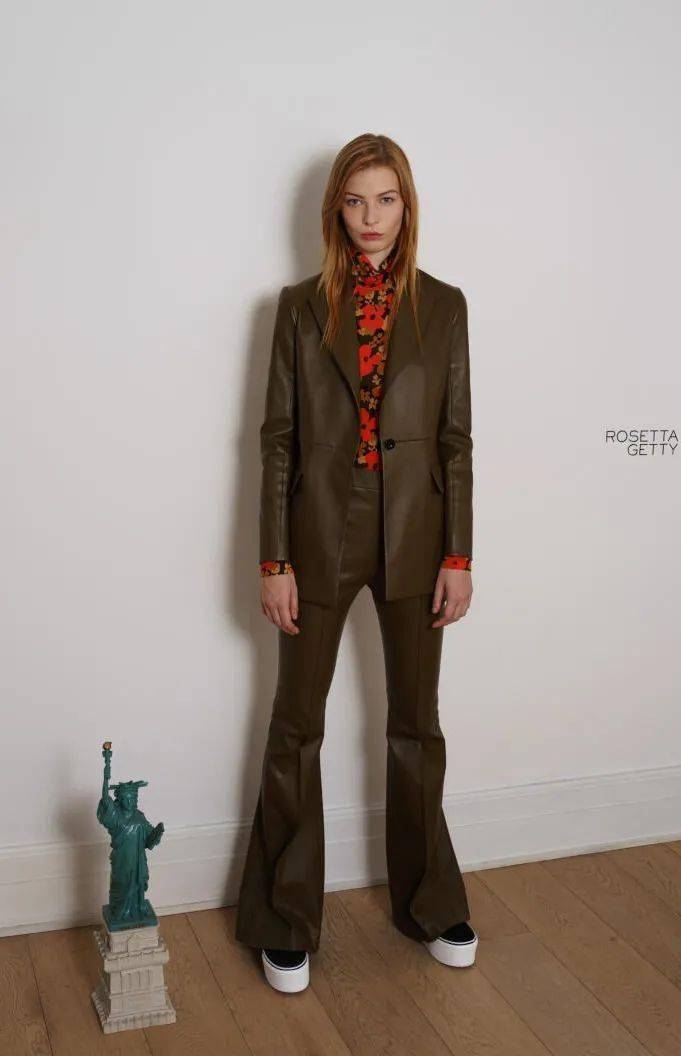 Kaia Gerber?。▌P雅·杰柏)用皮質(zhì)小西裝內(nèi)搭短上衣,毫不費(fèi)力的凹造型。